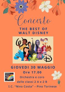 “Giovedì 30 maggio alle 17.00 siete invitati al saggio di fine anno delle classi 2B e 2A che si esibiranno in formazione di orchestra e coro con i più famosi brani dei cartoni Disney presso il Teatrino della scuola.